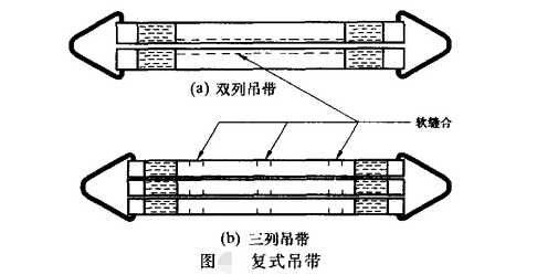 ③復式吊帶:由兩條或多條寬度相同并排放置的帶子構成的吊帶。兒條帶子共有一個末端件,各條帶子的邊緣相互連接。
