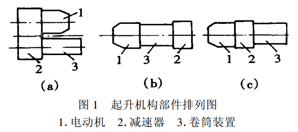 電動葫蘆的起升機構主要有:起升用錐形轉子制動電機、卷筒裝置、減速器和吊鉤裝置4個動力和傳動部件。電機、減速器和卷筒裝置3個部件的排列有平行軸(a)和同軸兩種排列方式,同軸式有分有(b)和(c)兩種排列,見圖1。