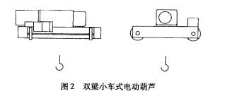 ③雙梁小車式由一臺固定式電動葫蘆和一雙軌型小車組成,該葫蘆小車沿雙梁上的兩條軌道運行(見圖2)。