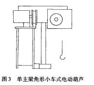 ④單主梁角形小車式由一臺固定式電動葫蘆和一角形電動小車組成。該小車沿安裝在單主梁橋架上的軌道運行(見圖3)。