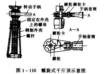 1、螺旋千斤頂,如圖1-110所示,簡單的千斤頂。其由鋼制外殼和螺桿及固定哎外殼上的螺母組成。轉動手柄即將重物頂起或降下。為了省力和頂升平穩(wěn),手柄常帶有棘輪,
