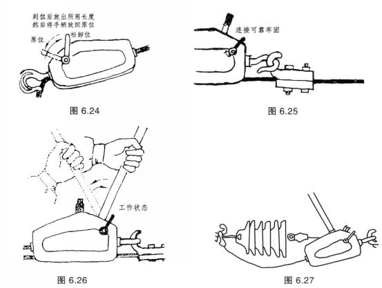 4、操作時(shí),先確認(rèn)松卸手柄已扳到“工作位置”,然后用葫蘆把圓頭(操作手柄)套在前進(jìn)桿上來回?cái)[動,收緊牽引繩使其受力(卸載),如圖6.26所示。