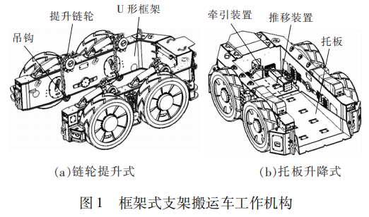 框架式支架搬運車主要用來拖運支架,如圖1所示,其工作機構(gòu)是基于U形框架的鏈輪提升式(或托板升降式)支架裝載機構(gòu)。鏈輪提升式機構(gòu)是利用4 個吊鉤鉤住支架起吊環(huán),通過操作提升鏈輪動作實現(xiàn)支架的提升裝載。倘若U形框架內(nèi)寬設(shè)計較窄,待支架進入框架時,支架兩側(cè)剩余空間較小,增加了工人的掛鉤難度,影響了支架的裝卸速度;另外,倘若提升鏈輪的離地高度設(shè)計較高,待支架進入框架時,壞損支架的側(cè)護板處于張開狀態(tài),張開的側(cè)護板極易與提升鏈輪發(fā)生碰撞,阻礙支架進入框架,同樣影響了支架的裝載速度。托板升降式機構(gòu)的裝卸架原理是在裝架時落下托板,利用牽引裝置將支架牽引至框架內(nèi),卸架時利用推移裝置將支架推出框架,以此實現(xiàn)支架的裝卸。倘若在使用過程中,托板滾輪卡滯,加之牽引裝置繩力設(shè)計有限,則會導致裝架困難;倘若推移裝置推出時,其導向套筒發(fā)生變形別卡,則會導致卸架困難,進而影響了支架搬運車的作業(yè)效率。