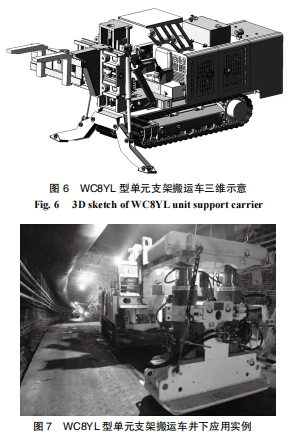 為提高單元支架的搬運效率,聯合專業廠家研發了 WC8YL 型單元支架專用搬運車,并已在神東集團錦界煤礦、新汶集團內蒙能源長城三礦、陜西麟北煤業園子溝煤礦等多家煤業公司成功應用。WC8YL 型單元支架搬運車三維示意及井下應用實例如圖 6、7 所示。