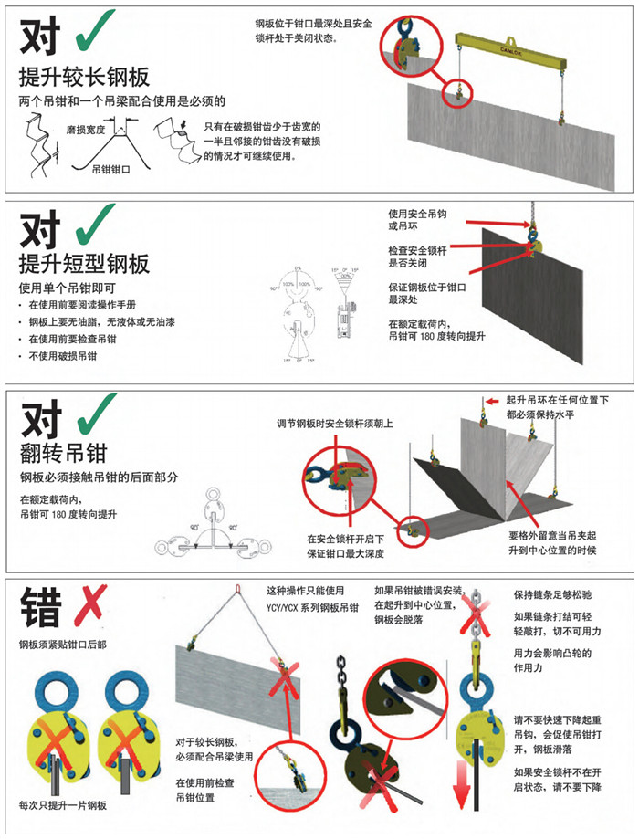 CDH型豎吊起重鉗適用于鋼板豎直吊裝,此種鋼板吊鉗采用首鋼低碳優質合金鋼制造,載荷范圍為0-10噸。它只能同時吊裝一塊鋼板,嚴禁層疊吊裝。吊鉗起 吊時必須將拉環手柄向上,以使彈簧拉緊,卸荷時拉環手柄向下,彈簧放松后簽字和鋼板才能分離,且吊裝過程中不得碰撞被吊物,嚴禁超載使用。帶彈簧鎖無作業 狀態下,鎖具自然加緊,吊上物體夾力成比例增強。本產品嚴格按國家3包執行,產品質量由中國人民保險公司(PICC)承保,請放心使用。